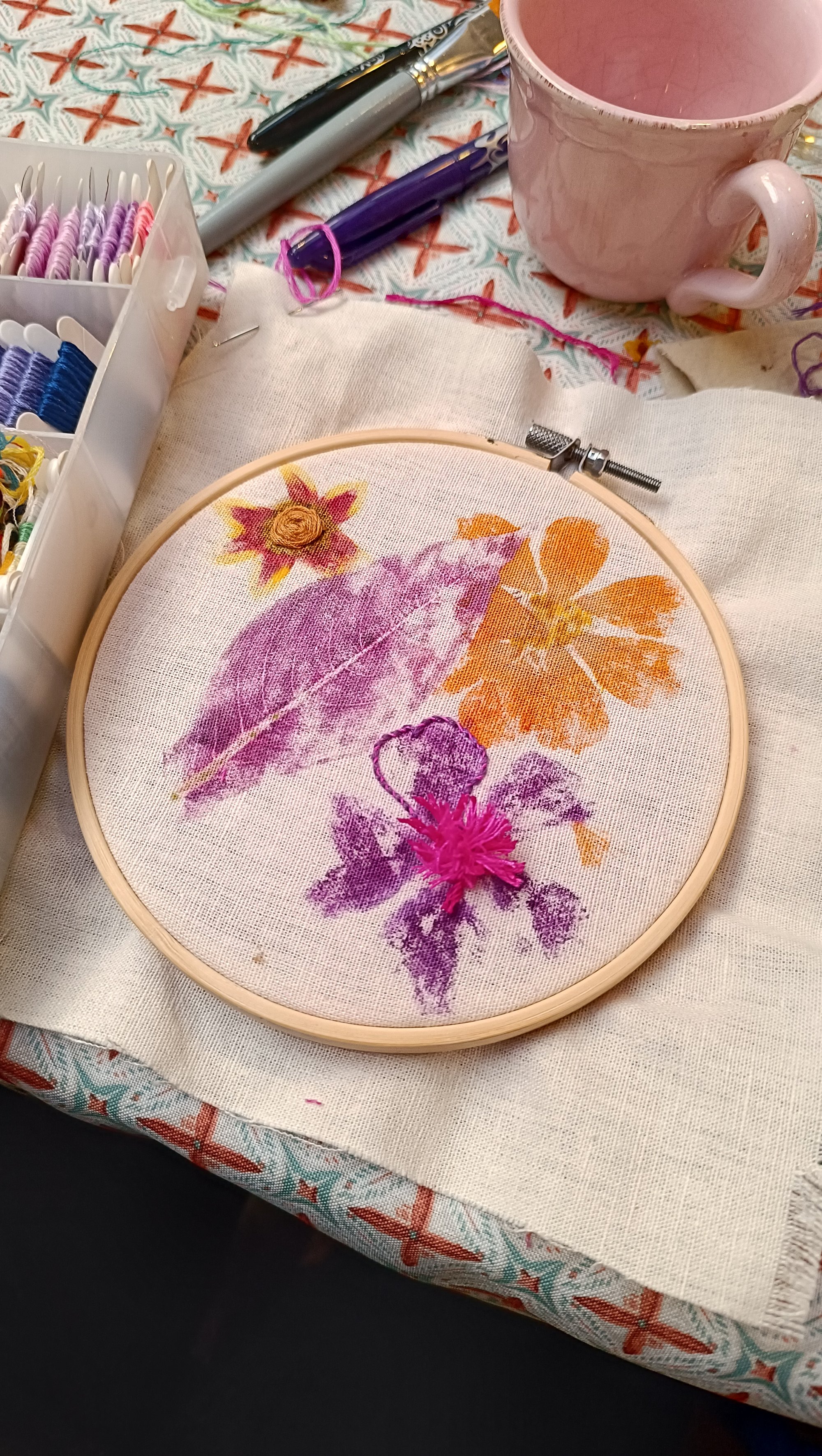 Le tataki-zomé, une technique japonaise d’impression directe de plantes fraîches sur tissu par martelage, et la broderie libre, pour rehausser les formes végétales de quelques points simples et expressifs.